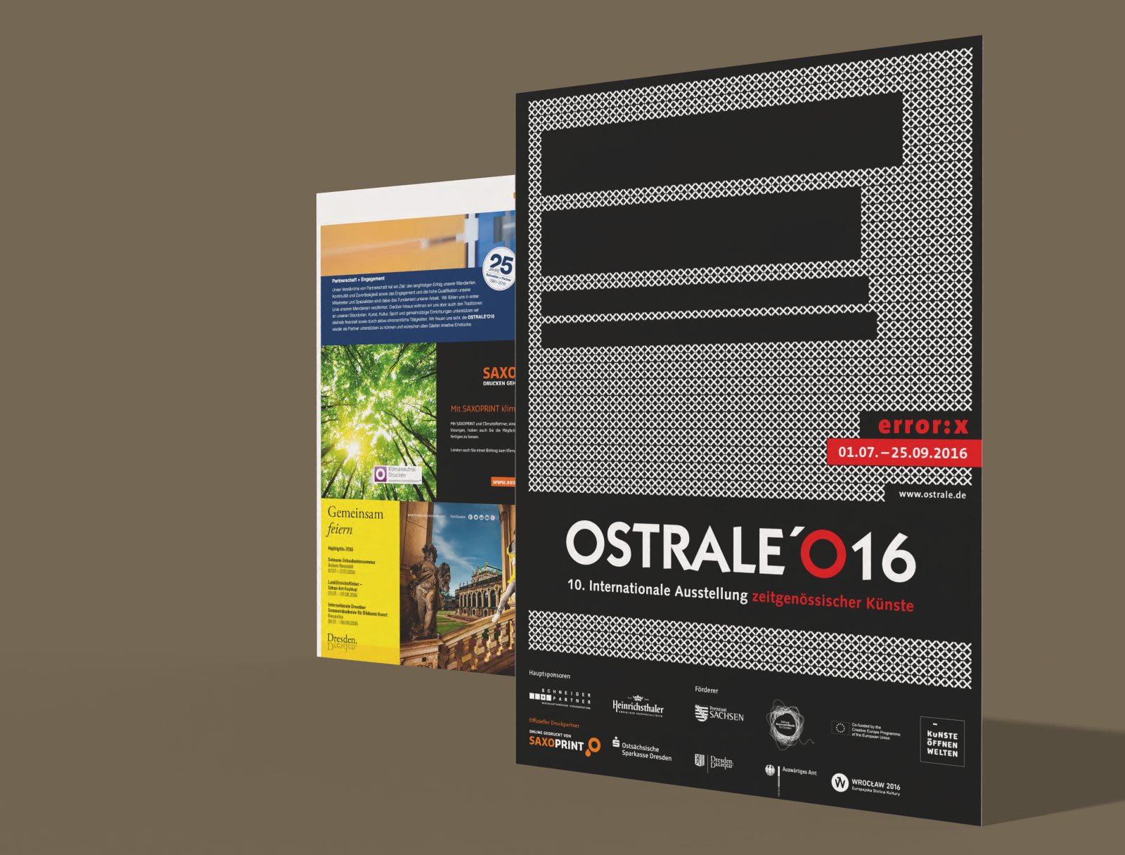 Die größte Ausstellung für zeitgenössische Kunst in Sachsen war in diesem Jahr dem Thema "Fehler" gewidmet. Fehler zulassen, Fehler erkennen, Fehler im oder als System – error: x. Die komplette Begleitung vom Keyvisual über Anzeigen, Ausstellungskatalog, Begleitblätter und Banner umöffentlichen Raum. Es war mir eine Ehre diese 10. Ausgabe zu betreuen.