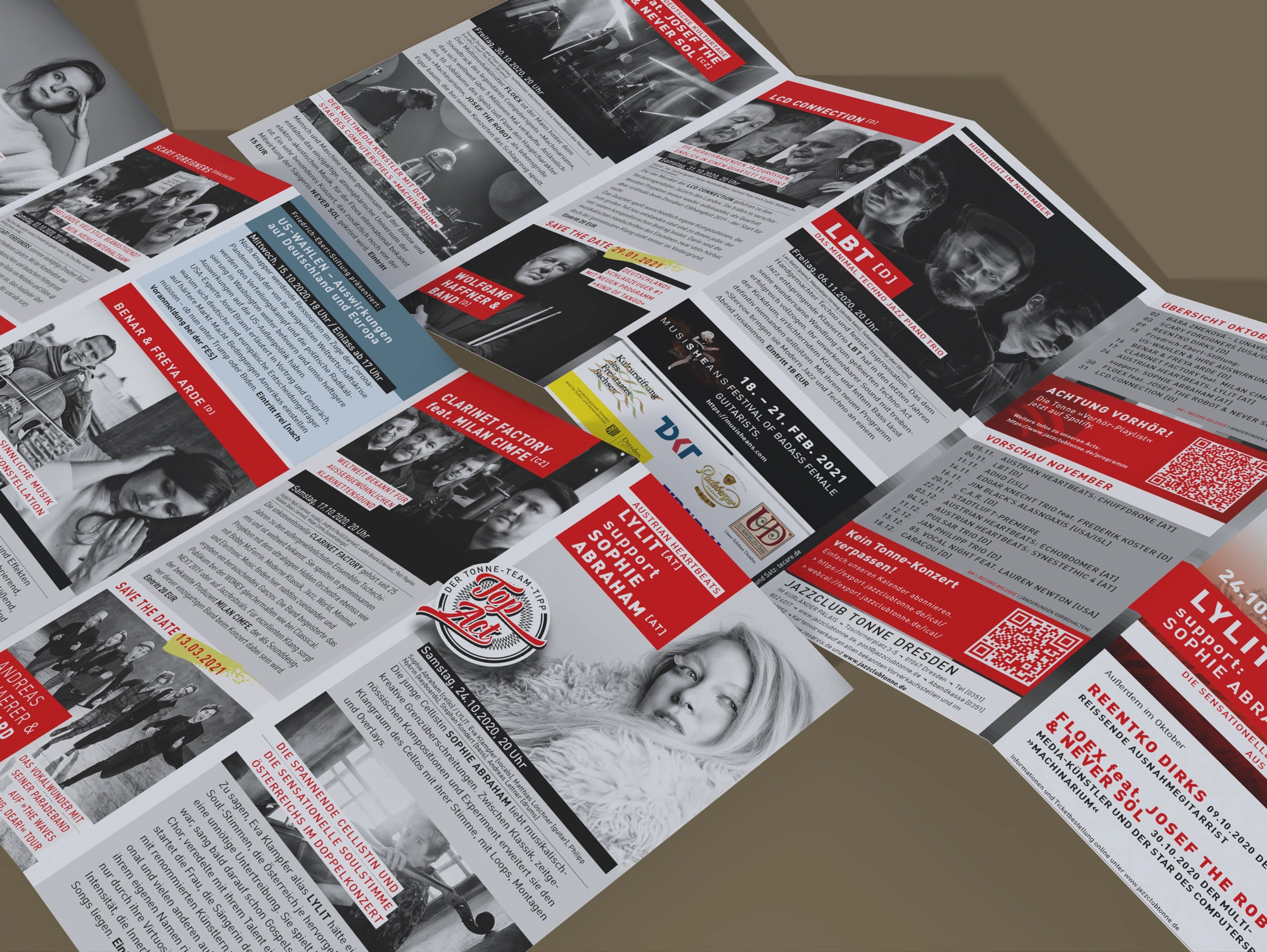 Nicht ist besser als Live-Musik im Lieblingsclub. Die Tonne in Dresden wurde mir freundschaftlich übergeben, direkt nach dem Logo-Relaunch 2010. Danach mussten neue Folder, Plakate und später auch die Website angepasst und komplett Neu erstellt werden. Umfassend monatlich und immer voller Abwechslung – wie der Jazz!